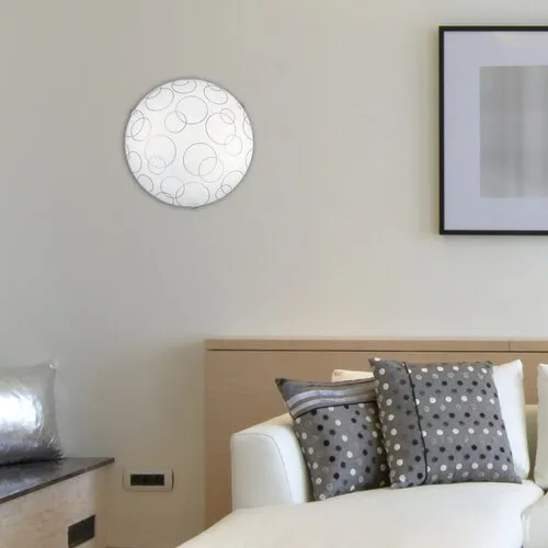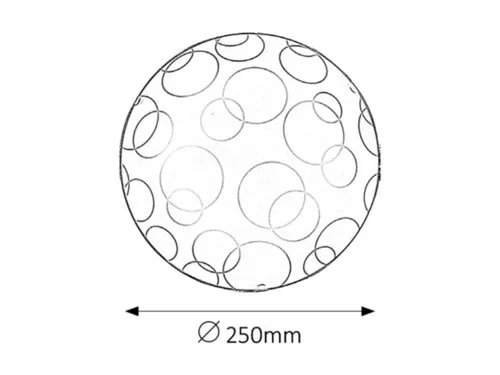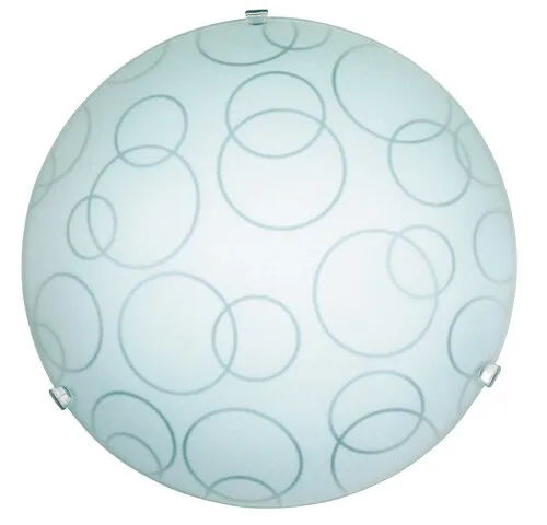 25 cm átmérőjű, időtlen megjelenésű mennyezeti lámpa. Fém és műanyag szerkezetű, fehér és áttetsző mintás üveg lámpabúrával. E27-es foglalatú, maximum 60W teljesítményű, halogén vagy LED fényforrással is használható.