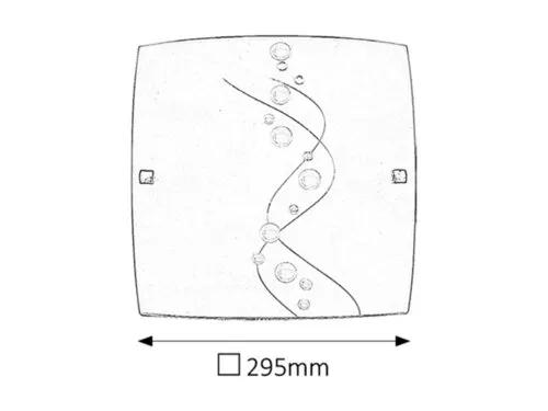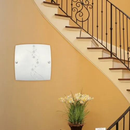 Modern megjelenésű mennyezeti lámpa 1 db foglalattal. 29,5 cm széles, fémből készített lámpatest fehér alapszínű, mintás üveg lámpabúrával és króm színű rögzítő csavarokkal. A lámpatest E27-es foglalatkialakítású, max. 60W teljesítményű hagyományos és energiatakarékos fényforrással is használható.