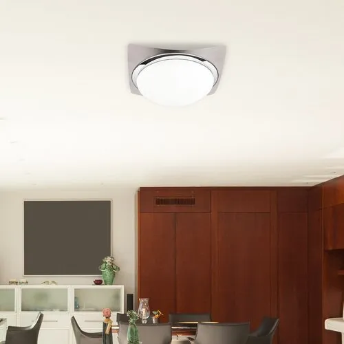 26 x 26 cm-es, modern megjelenésű mennyezeti lámpa. Szatin króm és króm színű, fém szerkezet fehér opálüveg lámpabúrával. E27-es foglalatú, maximum 60W teljesítményű, halogén vagy LED fényforrással is használható.
