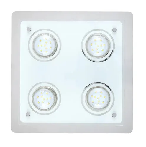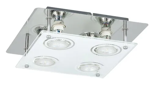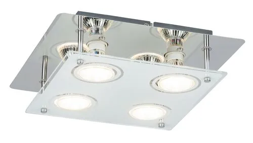 Modern megjelenésű mennyezeti lámpa hozzáadott energiatakarékos LED fényforrásokkal. 26 cm széles, tükörkróm színű fém lámpatest üveg lámpabúrával. A csomagban található LED fényforrások A+ energiaosztályú besorolás és 4x 5W teljesítmény mellett 400 lumenes fényerőt, valamint 3000 Kelvines, melegfehér színű fényt biztosítanak. Izzócsere esetén a lámpatest GU10-es foglalatú, max. 4x 15W teljesítményű, kizárólag energiatakarékos fényforrásokkal használható.