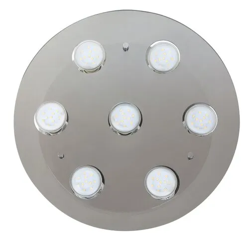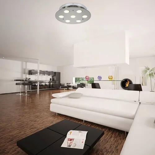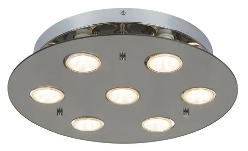 Modern és elegáns: a 7 db cserélhető LED fényforrással szerelt Naomi kerek mennyezeti lámpa gondoskodik a nappali vagy az étkező tökéletes megvilágításáról. A füstszínű üveg és króm kombinációjával készült lámpatestben meleg fehér fényű, energiatakarékos fényforrások kaptak helyet. A nagy méretű lámpa átmérője 380 mm. A LED fényforrások egyenként 5 W energiát fogyasztanak, fényerejük 400 lumen, színhőmérsékletük 3000 K, névleges élettartamuk mintegy 20 000 óra. A GU10-es típusú foglalatokba 7 db, egyenként maximum 15 W teljesítményű LED fényforrás helyezhető be. A mennyezeti lámpa nettó súlya 1,8 kg.