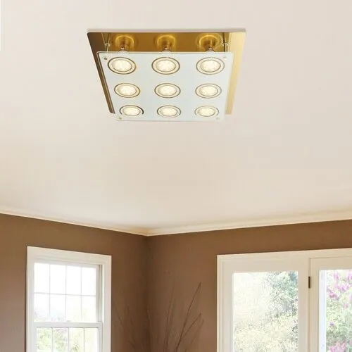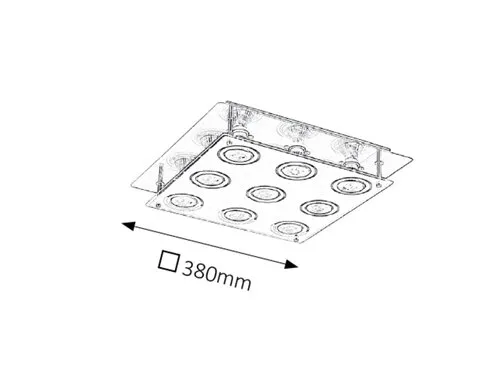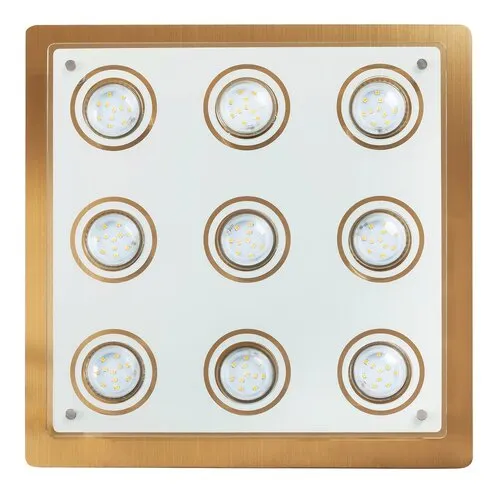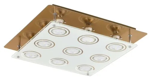 Modern megjelenésű mennyezeti lámpa energiatakarékos LED fényforrásokkal. 38 x 38 cm széles, fém és üveg kombinációjú szerkezet bronz színben. A lámpatestben elhelyezett LED fényforrások A+ energiaosztály besorolású és 9x 5W teljesítmény mellett 400 lumenes fényerőt, valamint 3000 Kelvines, melegfehér színű fényt biztosítanak. Fényforráscsere esetén a lámpatest GU10-es foglalatkialakítású, 9x max. 15W teljesítményű, kizárólag energiatakarékos fényforrásokkal használható.