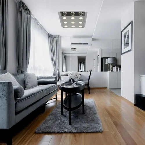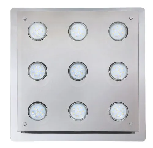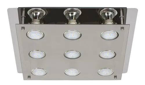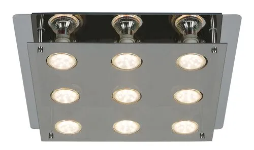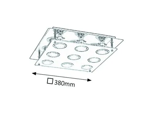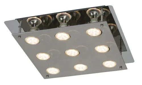 A 9 db LED fényforrással szerelt Naomi szögletes mennyezeti lámpa méretével és fényerejével egyaránt lenyűgöző hatást kelt. A 380x380 mm-es, füstszínű üveg és króm kombinációjával készült, egyedi formatervezésű lámpát elsősorban a nappaliba vagy az étkezőbe ajánljuk. A meleg fehér fényt kibocsátó LED fényforrások cserélhetők, egyenként 5 W energiát fogyasztanak, fényerejük 400 lumen, színhőmérsékletük 3000 K, névleges élettartamuk pedig 20 000 óra. A GU10-es típusú foglalatokba 9 db, egyenként maximum 15 W teljesítményű LED fényforrás helyezhető be. A lámpa nettó súlya 2,75 kg.