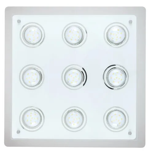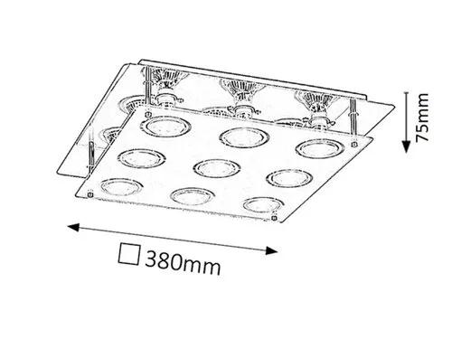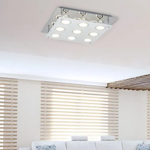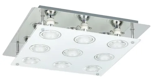 Modern megjelenésű mennyezeti lámpa hozzáadott energiatakarékos LED fényforrásokkal. 38 cm széles, tükörkróm színű fém lámpatest üveg lámpabúrával. A csomagban található LED fényforrások A+ energiaosztályú besorolás és 9x 5W teljesítmény mellett 400 lumen fényerőt, valamint 3000 Kelvines, melegfehér színű fényt biztosítanak. Izzócsere esetén a lámpatest GU10-es foglalatú, max. 9x 15W teljesítményű, kizárólag energiatakarékos fényforrásokkal használható.