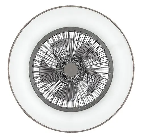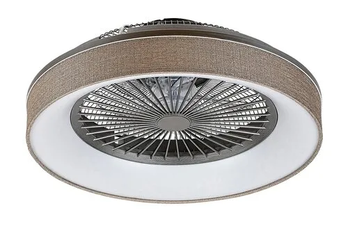 A kerek Benicio ventilátoros mennyezeti lámpa extra funkciók egész tárházát rejti magában, ezért különösen ajánljuk a nappaliba, a hálószobába vagy a dolgozószobába. A fémből készült, ezüstszínű lámpatestet szürke textilborítással ellátott fehér műanyagbúra egészíti ki. A Benicio beépített LED fényforrással rendelkezik, amelynek teljesítménye 35 W, fényereje 1050 lumen, színhőmérséklete pedig 3000–6000 K között állítható. A lámpa dimmelhető, azaz fényereje szabályozható, valamint memória funkcióval is rendelkezik. A 15 W-os motorral szerelt ventilátoron beállítható téli-nyári üzemmód, 6 sebességfokozat és időzítés. Minden extra funkció szabályozható távirányítóval, valamint a színhőmérséklet fali kapcsoló segítségével is állítható. A távirányítóhoz használatos elemek a csomag részét képezik. Az okos lámpa méretei a következők: átmérője 525 mm, mennyezettől mért távolsága 220 mm, beépítési átmérője 150 mm. Erre a modellre 5 év garanciát vállalunk.