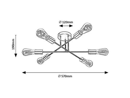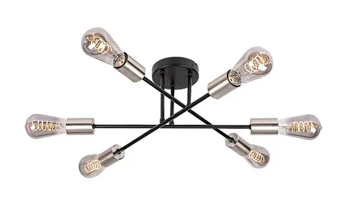 Az indusztriális stílusú Branwen hatos mennyezeti lámpa modern nappalink berendezésének jellegzetes darabja lehet. A teljes egészében fémből készült modell a matt fekete és a szatinkróm színt kombinálja, és kisméretű, kerek dísztalp segítségével rögzíthető a mennyezetre. A fényforrások a dísztalphoz rögzített három egymást keresztező vékony rúd ellentétes végein helyezkednek el. Mivel az izzókat nem takarja búra, érdemes ehhez a modellhez a megszokottól eltérő formájú, esztétikus fényforrásokat választani. A Branwen hat darab, egyenként legfeljebb 25 W teljesítményű fényforrással használható, a foglalatok típusa E27. Mivel ezt a mennyezeti lámpát elsősorban a nappaliba ajánljuk, természetes fehér fényű izzók használatát javasoljuk, amelyekkel modern, tiszta hatást érhetünk el otthonunk e nagy forgalmú helyiségében. A Branwen méretei a következők: átmérője 570 mm, beépítési átmérője 120 mm, mennyezettől mért távolsága pedig 190 mm. A mennyezeti lámpát fényforrások nélkül szállítjuk.