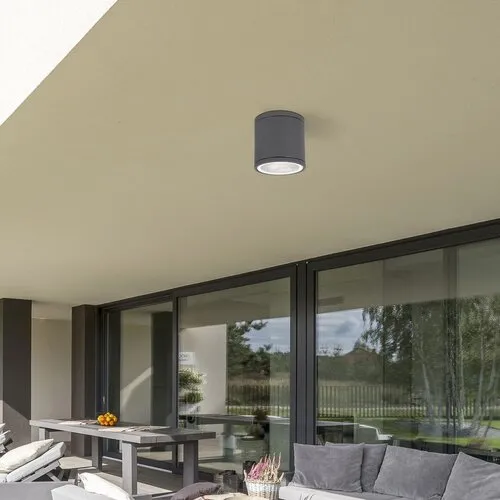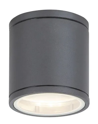 Industrial megjelenésű kültéri mennyezeti lámpa, 1 db foglalattal, lefelé világító kivitelben. 9 cm átmérőjű, antracit szürke színű fém ház és üveg lámpabúra, IP54-es védettséggel. A lámpatest GU10-es foglalatkialakítású, max. 35W teljesítményű energiatakarékos fényforrással is használható.