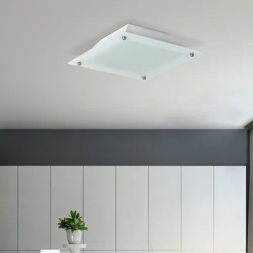 Minimalista stílusú, modern megjelenésű mennyezeti lámpa beépített energiatakarékos LED fényforrással. 40 x 40 cm széles, fém és üveg kombinációjú szerkezet fehér színnel. A beépített LED fényforrás A+ energiaosztály besorolású és 18W teljesítmény mellett 1440 lumenes fényerőt, valamint 4000 Kelvines, természetes fehér színű fényt biztosít. 5 év garanciával. A lámpatestben a fényforrás nem cserélhető.