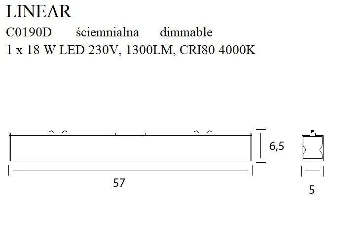 Moc/Power: 1 x 18W LED 230V, 1300 LM_x000D_, CRI80 4000K_x000D_ W: 57 cm, D: 5 cm, H: 6,5 cm_x000D_ Wykończenie/Detail finishing: czarne/black_x000D_ Materiał/Material: metal, akryl/ metal, acrylic_x000D_ Zasilacz + LED ściemnialny w komplecie/ Triac dimmable LED + driver included_x000D_ nie zawiera ściemniacza ściennego/ wall dimmer not included