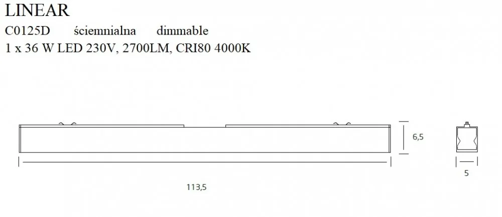 Moc/Power: 1 x 36W LED 230V, 2700 LM_x000D_, CRI80 4000K_x000D_ W: 113,5 cm, D: 5 cm, H: 6,5 cm_x000D_ Wykończenie/Detail finishing: białe/white_x000D_ Materiał/Material: metal, akryl/ metal, acrylic_x000D_ Zasilacz + LED ściemnialny w komplecie/ Triac dimmable LED + driver included_x000D_ nie zawiera ściemniacza ściennego/ wall dimmer not included