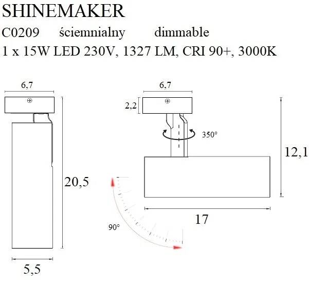 Moc/Power: 1 x 15W LED 230V, 1327 LM, CRI 90+, 3000K_x000D_ W: 17 cm, D: 5,5 cm, H: 12,1-20,5 cm, Ă: 5,5 cm_x000D_ WykoĹ„czenie/Detail finishing: biaĹ‚e/white_x000D_ MateriaĹ‚/Material: metal/ metal_x000D_ KÄ…t Ĺ›wiecenia/beam angle: 36°_x000D_ Transformator Ĺ›ciemnialny w komplecie/ dimmable trafo included