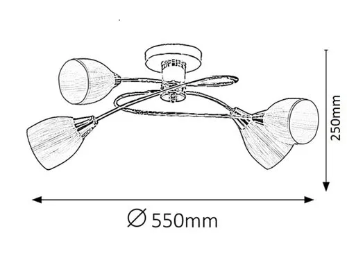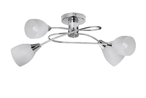 Modern megjelenésű mennyezeti lámpa 4 db foglalattal. 55 cm átmérőjű, króm színű fém test és fehér színű üveg lámpabúrák. A lámpatest E14-es foglalatkialakítású, max. 4x 60W teljesítményű energiatakarékos fényforrásokkal is használható.