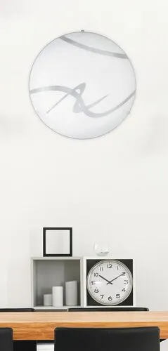 Időtlen megjelenésű mennyezeti lámpa beépített energiatakarékos LED fényforrással. Fém, üveg és műanyag kombinációjú szerkezet 40 cm átmérőjű, fehér alapszínű, mintás lámpabúrával és króm színű rögzítőkörmökkel. A beépített LED fényforrás A+ energiaosztály besorolású és 18W teljesítmény mellett 1440 lumenes fényerőt, továbbá 3000 Kelvines, melegfehér színű fényt ad. 5 év garanciával. A lámpatestben a fényforrás nem cserélhető.