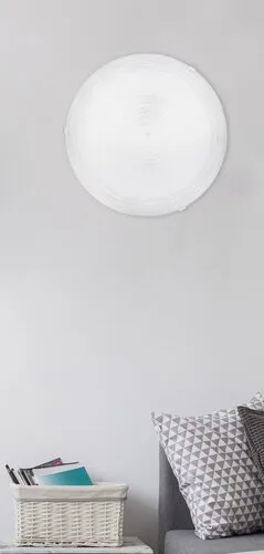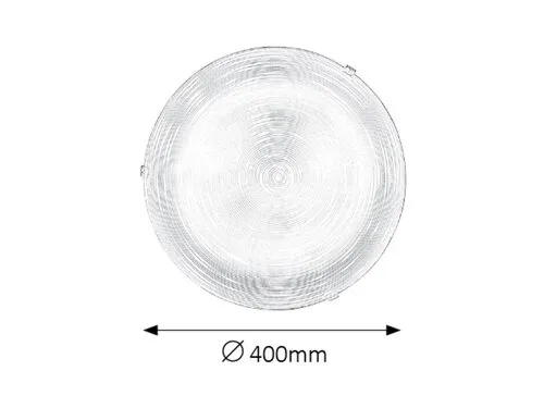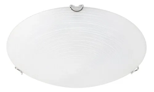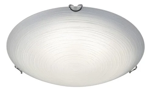 Időtlen megjelenésű mennyezeti lámpa beépített energiatakarékos LED fényforrással. Fém és üveg kombinációjú szerkezet 40 cm átmérőjű, fehér alapszínű, körmintás lámpabúrával és króm színű rögzítőkörmökkel. A beépített LED fényforrás A+ energiaosztály besorolású és 18W teljesítmény mellett 960 lumenes fényerőt, továbbá 3000 Kelvines, melegfehér színű fényt ad. 5 év garanciával. A lámpatestben a fényforrás nem cserélhető.