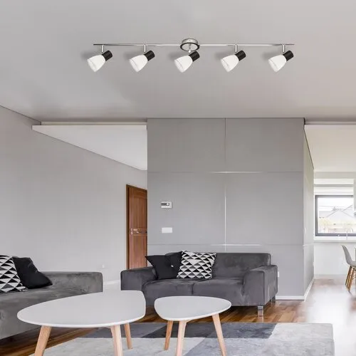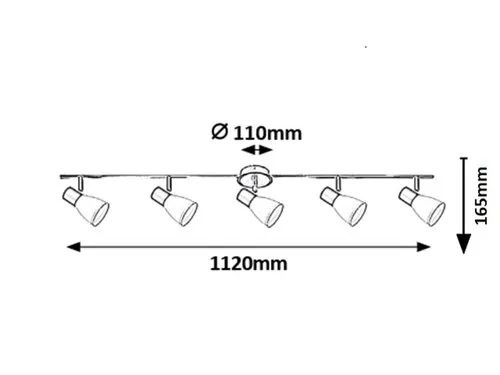 Modern megjelenésű mennyezeti spotlámpa 5 db foglalattal. 112 cm széles, fekete és króm színkombinációjú fém lámpatest és pozícionálható üveg lámpabúrák. A lámpatest E-14-es foglalatú, max. 5x 40W teljesítményű energiatakarékos fényforrásokkal is használható.
