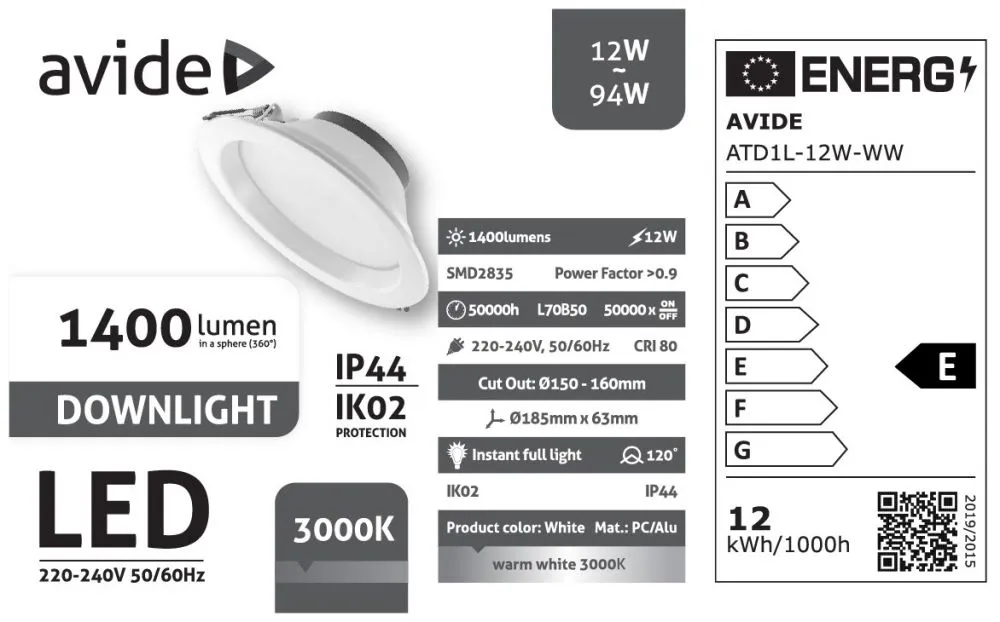 Avide LED Downlight Kerek IP44 12W 1400lm WW 3000K