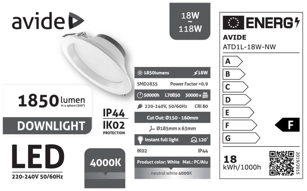 Avide LED Downlight Kerek IP44 18W 1850lm NW 4000K