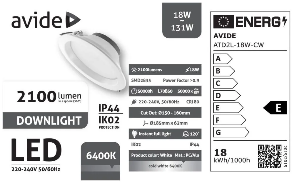 Avide LED Downlight Kerek IP44 18W 2100lm CW 6400K
