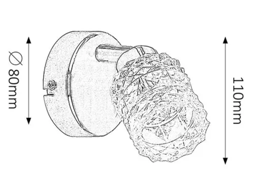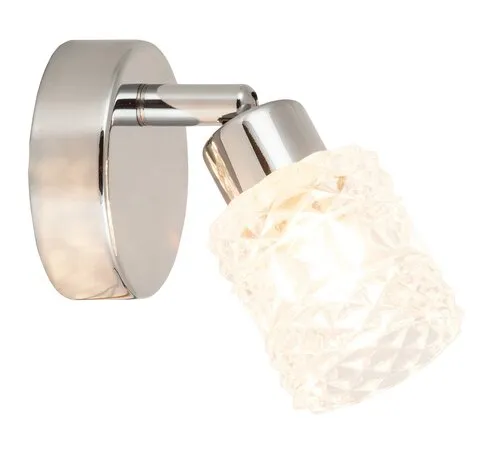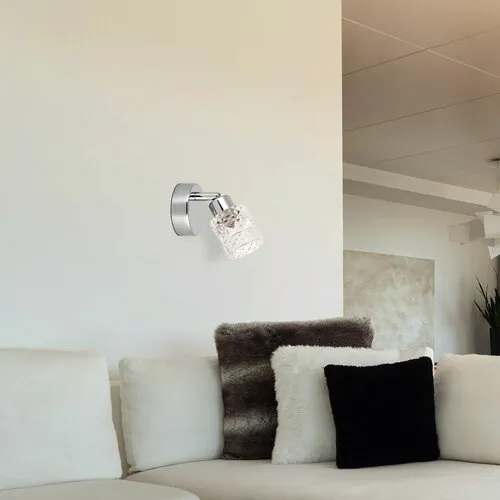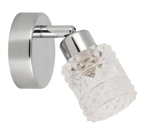 Modern megjelenésű, falra szerelhető spotlámpa fényforrással. 11 cm magas, króm színű, fémből készített lámpatest és pozícionálható, különleges kialakítású üveg lámpabúra. A lámpatestben elhelyezett fényforrás C energiaosztály besorolású és 33W teljesítmény mellett 480 lumenes fényerőt és 2800 Kelvines, azaz melegfehér színű fényt biztosít. A lámpatest G9-es foglalatú, max. 40W teljesítményű energiatakarékos fényforrással is használható.