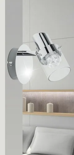 Modern megjelenésű spotlámpa beépített energiatakarékos LED fényforrással. 12 cm magas, króm színű, fémből készített lámpatest pozícionálható, áttetsző üvegkristály díszítésű üveg lámpabúrával. A beépített LED fényforrás A+ energiaosztályú besorolás és 4,5W teljesítmény mellett 360 lumenes fényerőt és 3000 Kelvines, azaz melegfehér színű fényt kínál. 5 év garanciával. A lámpatestben elhelyezett fényforrás nem cserélhető.