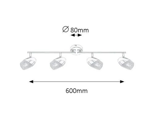 Modern megjelenésű mennyezeti spotlámpa energiatakarékos LED izzókkal. 60 cm széles, króm színű fém lámpatest és pozícionálható, üveg és fém kombinációjú lámpabúrák, IP20-as védettséggel. A lámpatestben elhelyezett LED izzók A+ energiaosztály besorolású és 4x 4W teljesítmény mellett 4x 400 lumen fényerőt, valamint 4000 Kelvines, természetes fehér színű fényt biztosítanak. izzócsere estén a lámpatest E-14-es foglalatkialakítású, max. 40W teljesítményű izzókkal használható.