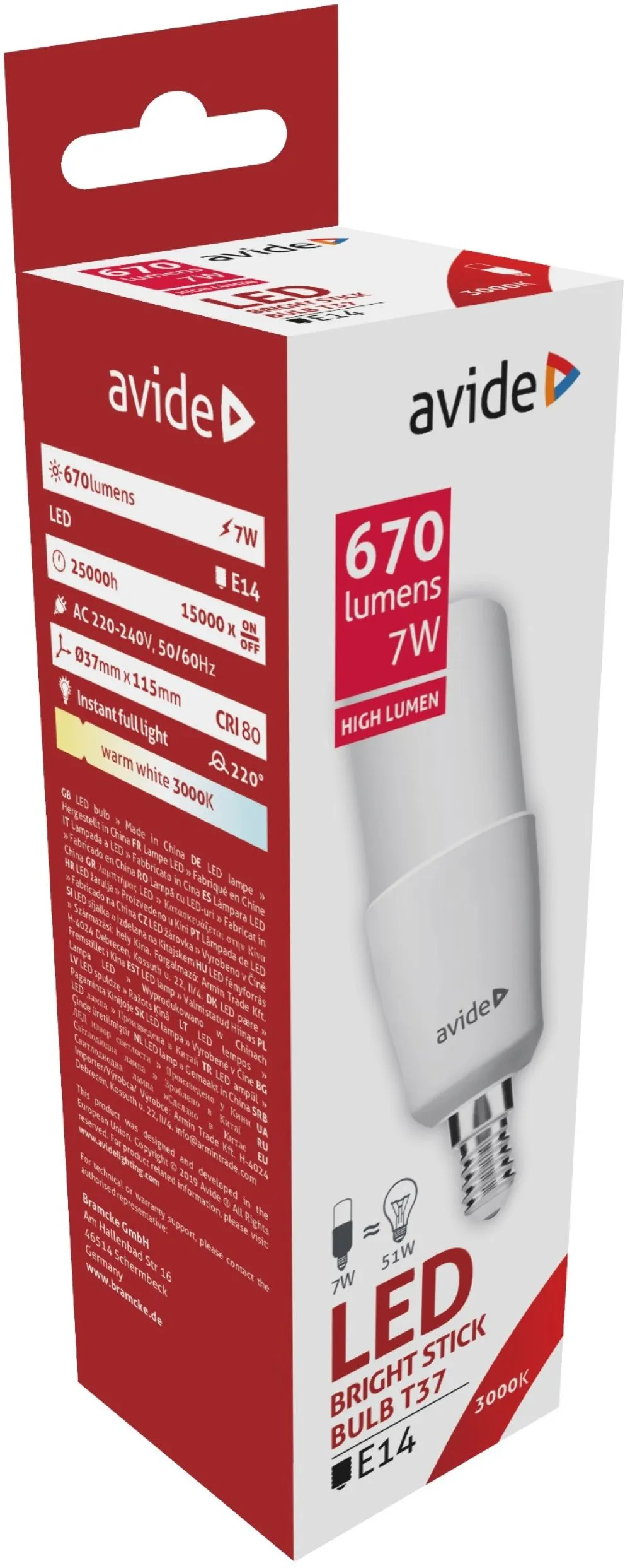 Avide LED Bright Stick izzó T37 7W E14 WW 3000K