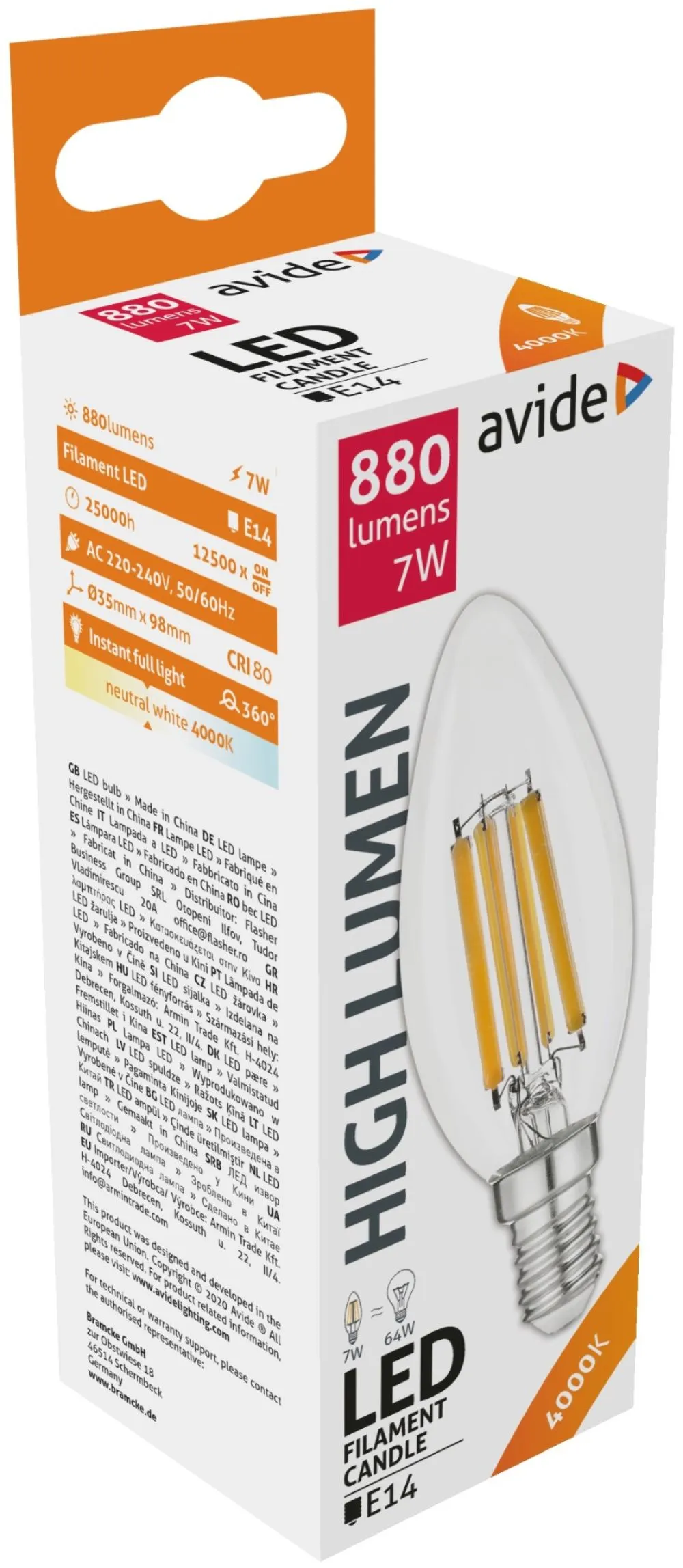 Avide LED Filament Candle 7W E14 360° NW 4000K High Lumen