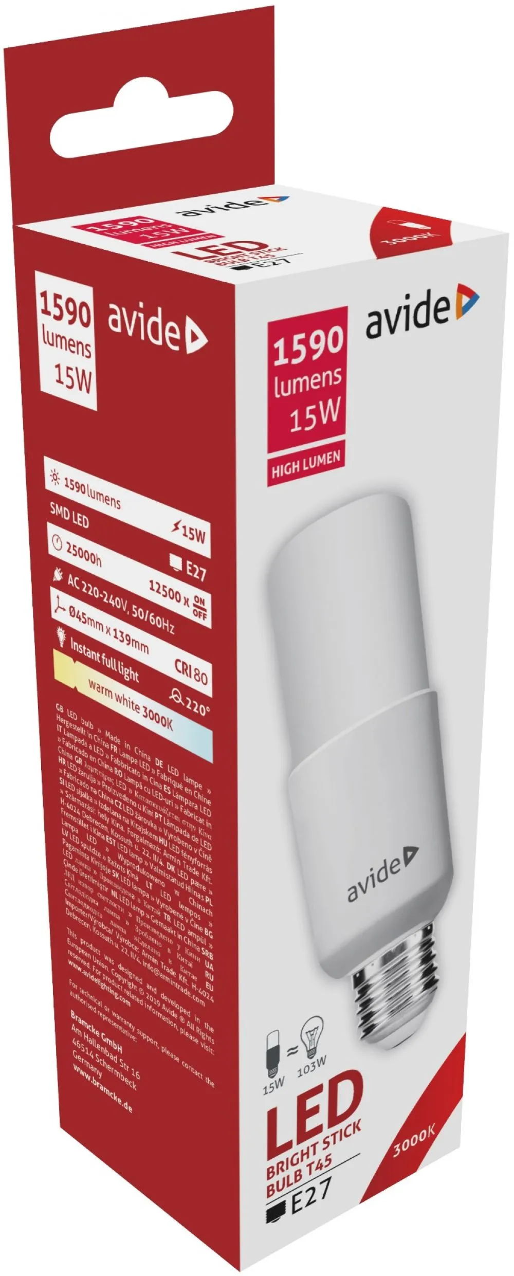 Avide LED Bright Stick izzó T45 15W E27 WW 3000K