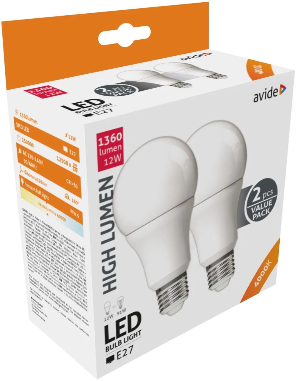 Avide LED Globe Twin Pack A60 12W E27 NW 4000K