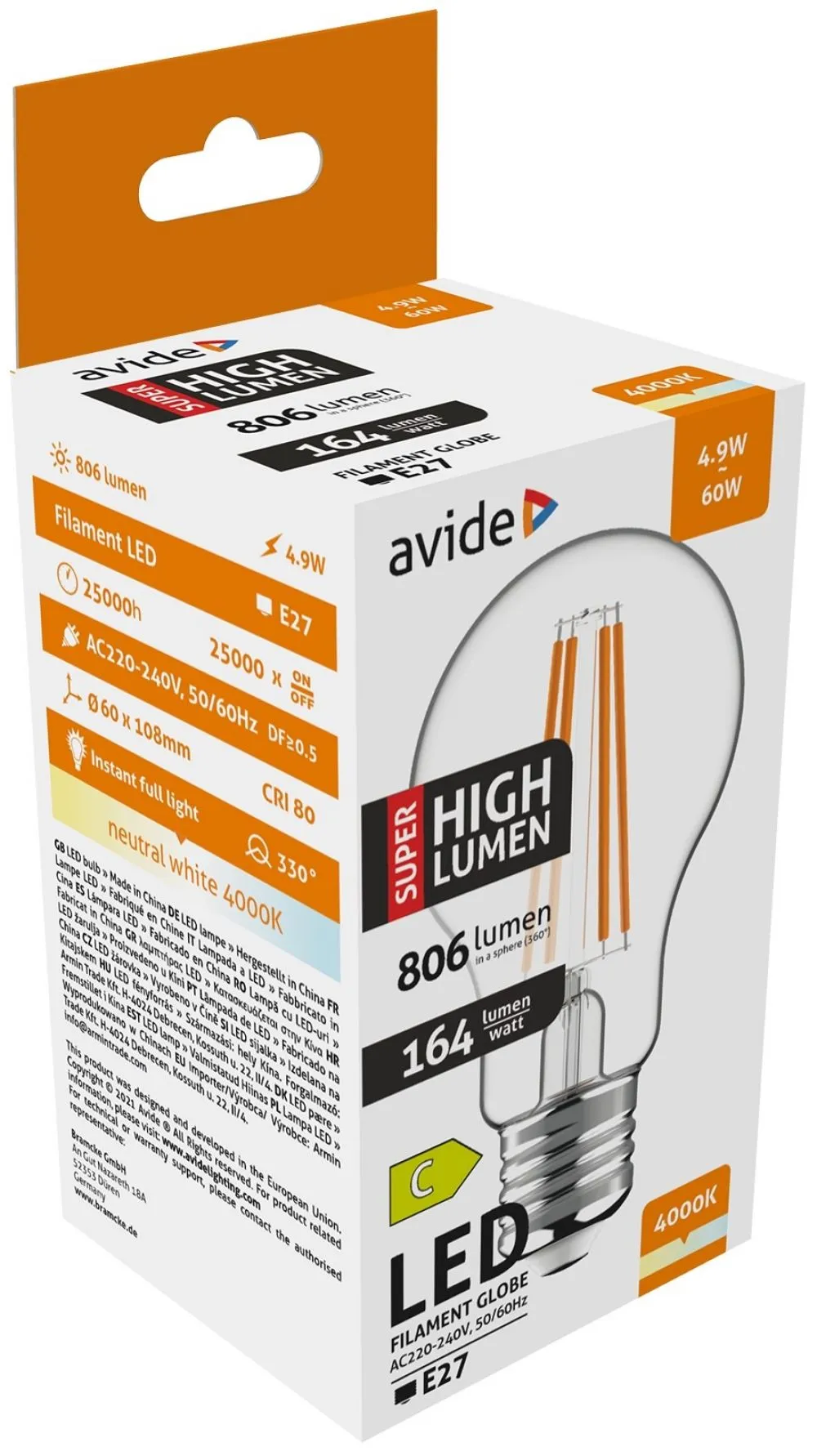 Avide LED Filament Globe 4.9W E27 A60 NW 4000K Super High Lumen