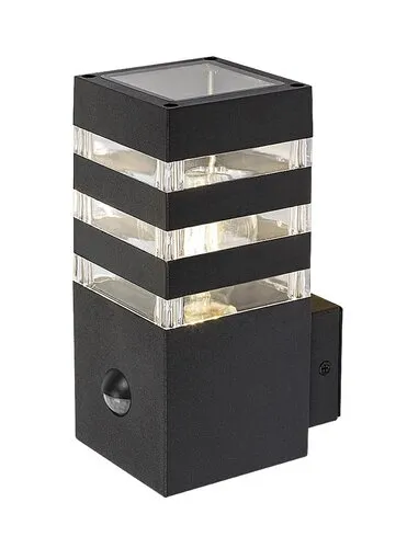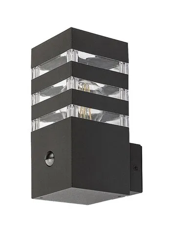 A modern stílusú Ankara kültéri mozgásérzékelős fali lámpa jó választás lehet mind a teraszra, mind a ház külső falára, például a bejárathoz vezető gyalogút megvilágítására. Az alumíniumból készült antracitszürke lámpatestet sávosan előtűnő átlátszó műanyagbúra egészíti ki, ami izgalmas megvilágítást biztosít. A lámpa az alsó részéből hátrafelé kinyúló elem segítségével rögzíthető a falon. Az Ankara egy darab legfeljebb 12 W teljesítményű fényforrással használható, a foglalat típusa E27. Az intelligens szenzor, amely a lámpa fényerejét a körülményeknek megfelelően változtatja, 6-8 méter távolságból, 105°-os látószögben érzékeli a mozgást. A kültéri lámpa méretei a következők: szélessége 90 mm, magassága 200 mm, faltól mért távolsága 135 mm. A lámpa IP44-es védettsége garantálja, hogy legfeljebb 1 mm átmérőjű tárgyak behatolása ellen, valamint bármilyen irányból fröccsenő víz ellen védett. Az Ankara kültéri mozgásérzékelős fali lámpát fényforrás nélkül szállítjuk.