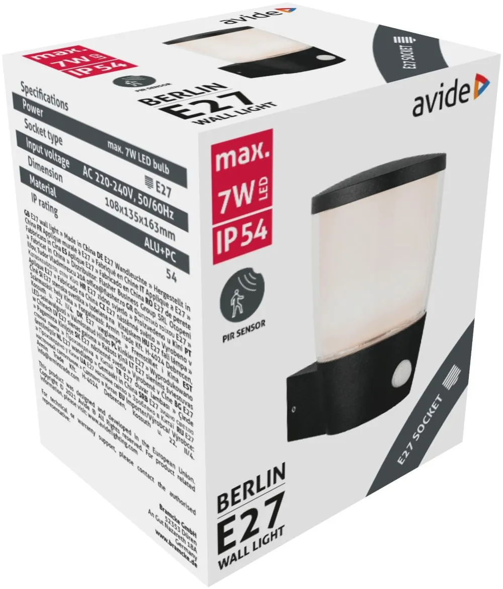 Avide kültéri fali lámpa Berlin 1xE27 mozgásérzékelővel IP54