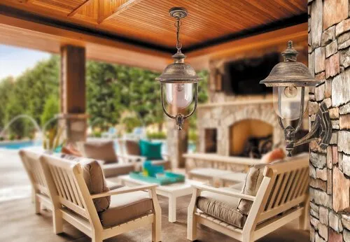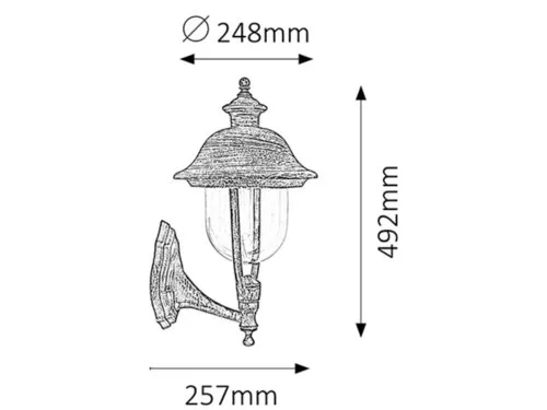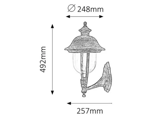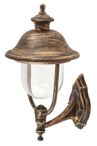 Klasszikus megjelenésű kültéri fali lámpa 1 db foglalattal, felfelé irányított búrával. 49,2 cm magas, 25,7 cm a faltól mért távolsága, antik arany színű fém lámpatest és műanyag lámpabúra, IP44-es, azaz fröccsenő víz és por elleni védelemmel. A lámpatest E27-es foglalatú, max. 100W teljesítményű fényforrással használható.
