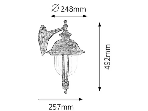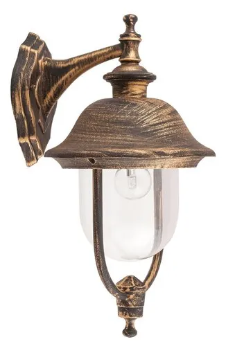 Klasszikus megjelenésű kültéri fali lámpa 1 db foglalattal, lefelé irányított búrával kivitelben. 49,2 cm magas, 25,7 cm a faltól mért távolsága, antik arany színű fém lámpatest és műanyag lámpabúra, IP44-es, azaz fröccsenő víz és por elleni védelemmel. A lámpatest E27-es foglalatú, max. 100W teljesítményű fényforrással használható.