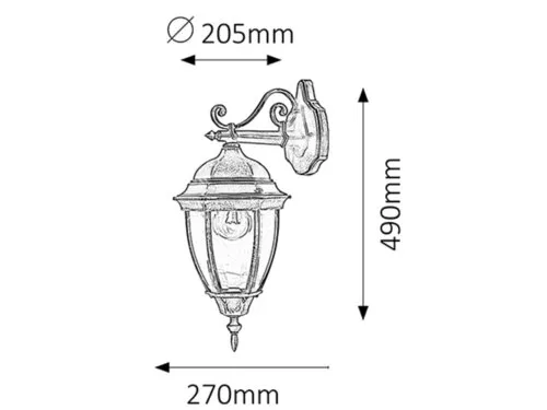 Klasszikus megjelenésű kültéri fali lámpa 1 db foglalattal, lefelé irányított búrával kivitelben. 49 cm magas, 27 cm a faltól mért távolsága, antik arany színű fém lámpatest és víztiszta üvegbetétes lámpabúra, IP44-es, azaz fröccsenő víz és por elleni védelemmel. A lámpatest E27-es foglalatú, max. 100W teljesítményű fényforrással használható.