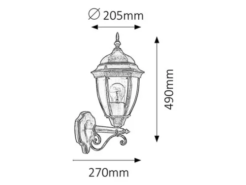 Klasszikus megjelenésű kültéri fali lámpa 1 db foglalattal, felfelé irányított búrával. 49 cm magas, 27 cm a faltól mért távolsága, antik arany színű fém lámpatest és víztiszta üvegbetétes lámpabúra, IP44-es, azaz fröccsenő víz és por elleni védelemmel. A lámpatest E27-es foglalatú, max. 100W teljesítményű fényforrással használható.