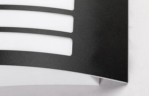 Modern megjelenésű kültéri fali lámpa, UV sugárzásnak ellenálló kivitelben, IP44-es, azaz fröccsenő víz elleni védelemmel. A 10 cm magas, 31,8 cm széles, íves formájú, antracit szürke színű fém házból és műanyag lámpabúrából összeállított lámpatest E27-es foglalatú, max. 14W teljesítményű, energiatakarékos fényforrással használható. A modell hagyományos fényforrással nem üzemeltethető!