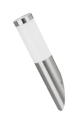 Modern megjelenésű kültéri falikar UV sugárzásnak ellenálló kivitelben. 38 cm magas, 7,6 cm átmérőjű, döntött talapzatú, rozsdamentes acél színű fém lámpatest és fehér színű műanyag lámpabúra, IP44-es, azaz fröccsenő víz és por elleni védelemmel. A lámpatest E27-es foglalatú, max. 25W teljesítményű energiatakarékos fényforrással is használható.