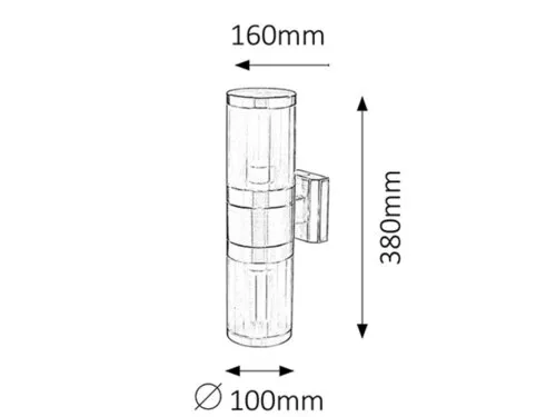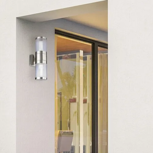 Modern megjelenésű, felfelé és lefelé is világító kültéri falikar 2 db foglalattal. 16 cm kinyúlású, 38 cm magas, 10 cm átmérőjű, rozsdamentes acél színű, fémből készített lámpatest és áttetsző műanyag lámpabúrák, UV sugárzásnak ellenálló, illetve IP44-es, azaz fröccsenő víz és por ellen minden irányban védett kivitelben. A lámpatest E-27-es foglalatú, max. 2x 60W teljesítményű fényforrásokkal használható.