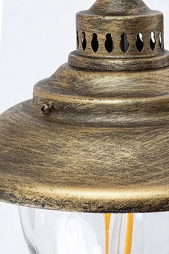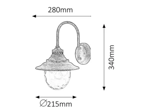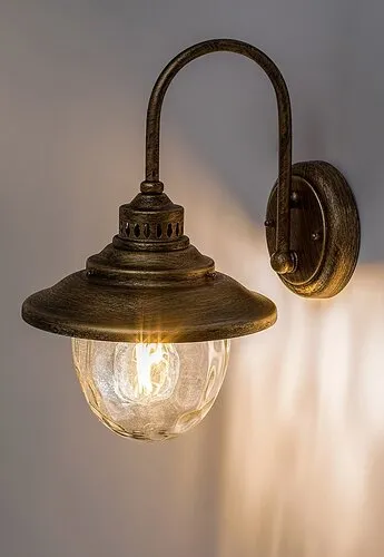 Időtlen megjelenésű kültéri fali lámpa 1 db foglalattal. 28 cm kinyúlású, 34 cm magas, antik arany színű, fémből készített lámpatest és üveg lámpabúra, IP43-as védelemmel. A lámpatest E27-es foglalatú, max. 60W teljesítményű fényforrással használható.