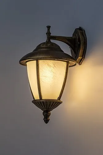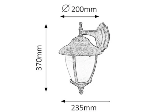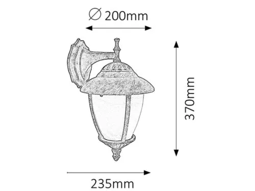Klasszikus megjelenésű kültéri falikar 1 db foglalattal. 23,5 cm kinyúlású, 37 cm magas, antik arany színű, fémből készített lámpatest fehér alabástromüveg lámpabúrával, IP43-as védettséggel. A lámpatest E27-es foglalatú, max. 60W teljesítményű fényforrással használható.