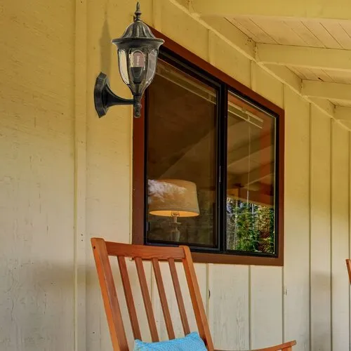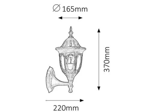 Klasszikus megjelenésű kültéri falikar 1 db foglalattal. 22 cm kinyúlású, 37 cm magas, antik arany színű, fémből készített lámpatest és üvegbúra, IP43-as védettséggel. A lámpatest E27-es foglalatú, max. 60W teljesítményű fényforrással használható.