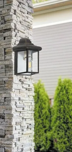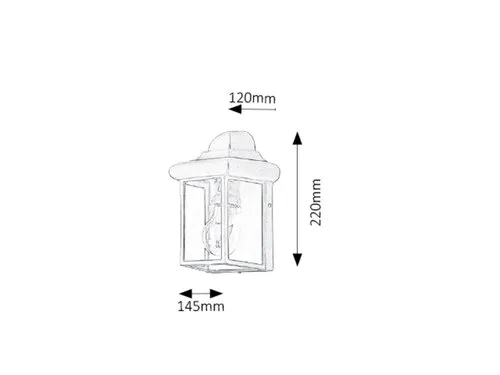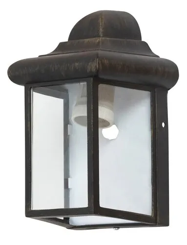 Klasszikus megjelenésű kültéri fali lámpa 1 db foglalattal. 22 cm magas, 12 cm kinyúlású, antik arany színű fém lámpatest és üveg lámpabúra, IP43-as védettséggel. A lámpatest E27-es foglalatkialakítású, max. 60W teljesítményű energiatakarékos fényforrással is használható.
