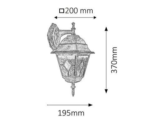 Klasszikus megjelenésű kültéri falikar 1 db foglalattal, alsó állású kivitelben. 37 cm magas, 19,5 cm kinyúlású, antik arany színű fém lámpatest és színes betéttel díszített üveg lámpabúra, IP43-as védettséggel. A lámpatest E-27-es foglalatú, max. 60W teljesítményű energiatakarékos fényforrással is használható.