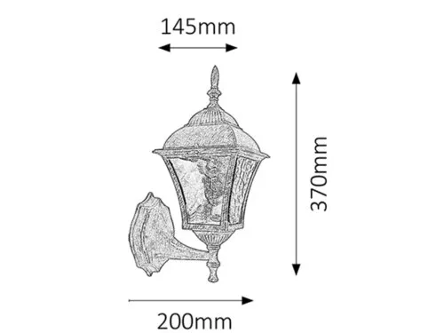 Klasszikus megjelenésű kültéri fali lámpa 1 db foglalattal, felfelé irányított búrával. 37 cm magas, 20 cm a faltól mért távolsága, antik arany színű fém lámpatest és katedrál üveges lámpabúra, IP43-as védettséggel. A lámpatest E27-es foglalatú, max. 60W teljesítményű fényforrással használható.