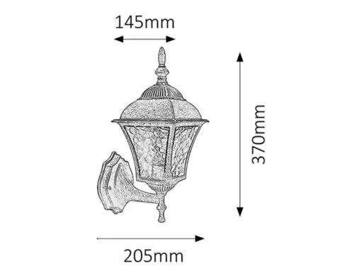 Klasszikus megjelenésű kültéri fali lámpa 1 db foglalattal, felfelé irányított búrával. 37 cm magas, 20,5 cm a faltól mért távolsága, antik ezüst színű fém lámpatest és katedrál üveges lámpabúra, IP43-as védettséggel, azaz fröccsenő víz elleni védelemmel. A lámpatest E27-es foglalatú, max. 60W teljesítményű fényforrással használható.