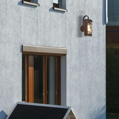 Rusztikus stílusú kültéri fali lámpa 1 db foglalattal. 37 cm magas, 18 cm kinyúlású, barna színű, rozsda-effektezett fém lámpatest és opálfehér műanyag lámpabúra, IP44-es, azaz por és fröccsenő víz elleni védelemmel. A lámpatest E27-es foglalatkialakítású, max. 60W teljesítményű energiatakarékos fényforrással is használható.