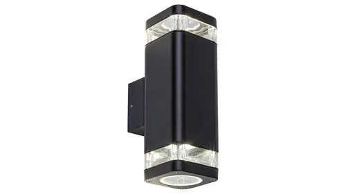 A modern formatervezésű Sintra kültéri fali lámpa remek választás, ha felfelé és lefelé világító modellt keresünk. Felszerelhetjük a bejárati ajtó mellé, illetve a ház külső falára, ahol erős fénnyel világítja meg a járdát. Az alumíniumból készült, matt fekete színű lámpát átlátszó műanyag búra egészíti ki. A Sintra két darab, egyenként legfeljebb 25 W teljesítményű fényforrással használható, a foglalatok típusa GU10. IP44-es védettség garantálja, hogy ez a modell legfeljebb 1 mm átmérőjű tárgyak behatolása ellen, valamint bármilyen irányból fröccsenő víz ellen védett. A szögletes kültéri lámpa méretei a következők: szélessége 80 mm, magassága 230 mm, faltól mért távolsága 115 mm. A lámpát fényforrások nélkül szállítjuk.
