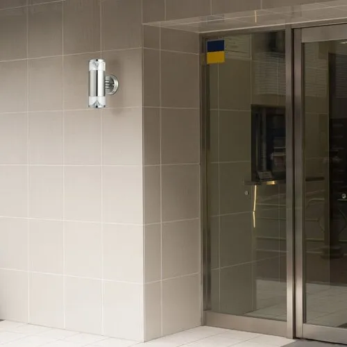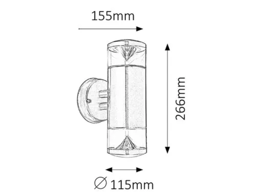 Modern megjelenésű kültéri fali lámpa, hozzáadott, energiatakarékos LED fényforrásokkal, UV sugárzásnak ellenálló, le- és felfelé világító kivitelben. 26,6 cm magas, 11,5 cm a faltól mért távolsága, rozsdamentes acélból készített lámpatest és műanyag lámpabúrák, IP44-es, azaz fröccsenő víz és por elleni védelemmel. A csomagban található LED fényforrások 4,5W teljesítmény mellett 340 lumenes fényerőt és 3000 Kelvines, melegfehér színű fényt biztosítanak. Izzócsere esetén a lámpatest GU10-es foglalatú, max. 2x 9W teljesítményű, kizárólag energiatakarékos fényforrásokkal használható.