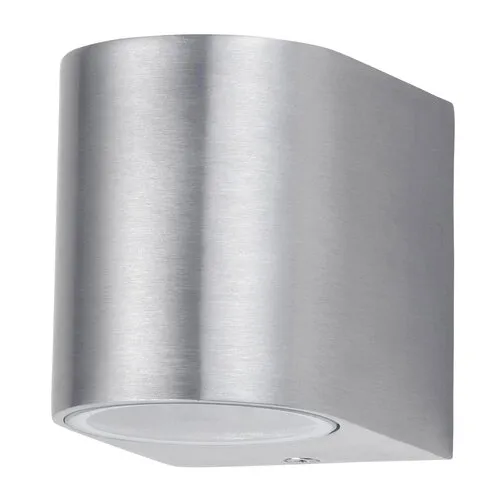 Modern megjelenésű kültéri fali lámpa 1 db foglalattal, lefelé világító kivitelben. 8 cm magas, 6,5 cm széles, szálcsiszolt alumínium színű fémből készített lámpatest és üveg lámpabúra, IP44-es, fröccsenő víz és por elleni védelemmel. A lámpatest GU10-es foglalatú, max. 35W teljesítményű energiatakarékos fényforrással is használható.
